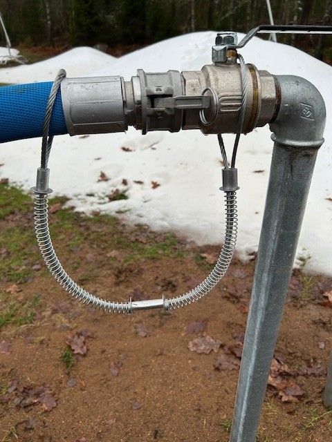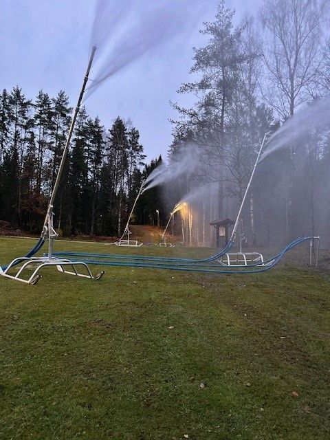 Full fart med montering. Snösystemet består av en slinga med 102mm stålrör för högtrycksvatten, och en 90mm luftslang för tryckluft. Var 30-36m ansluts uttagspunkter för både vatten och luft (s.k. hydranter).