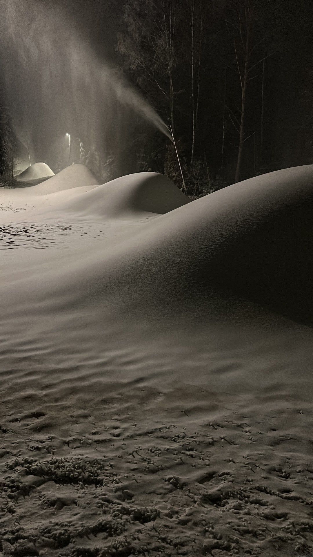 Nu har vi fimpat blöjan och kört alla våra 10 lansar. Har nu producerat ca. 1300m3 snö från stugan fram till ängen och ner över ängen. Nästa stora steg är utschaktning och spårläggning.