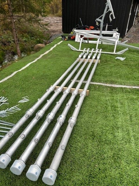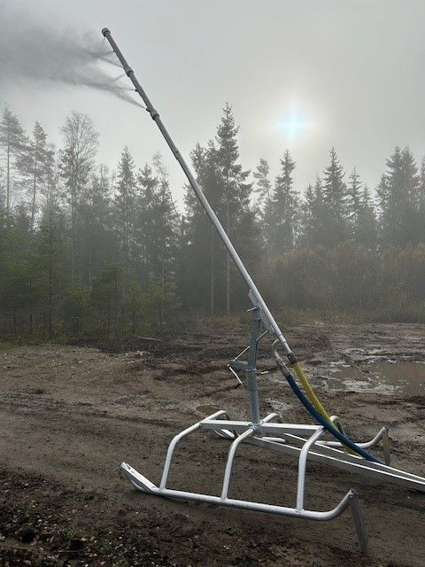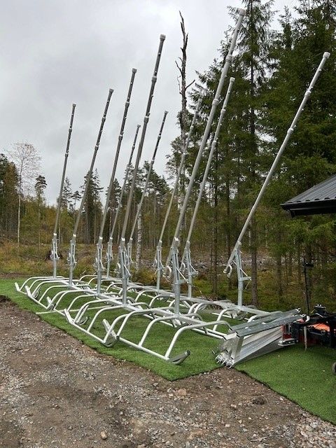 En stor dag. 10st. Nessy 4.5m höga snölansar ihopmonterade och redo för drift. Energisnåla och absolut top notch. Lansarna står på en lätt aluminiumsläde så vi kan flytta runt och lägga snön exakt där vi vill, och därmed minimera schaktarbetet.