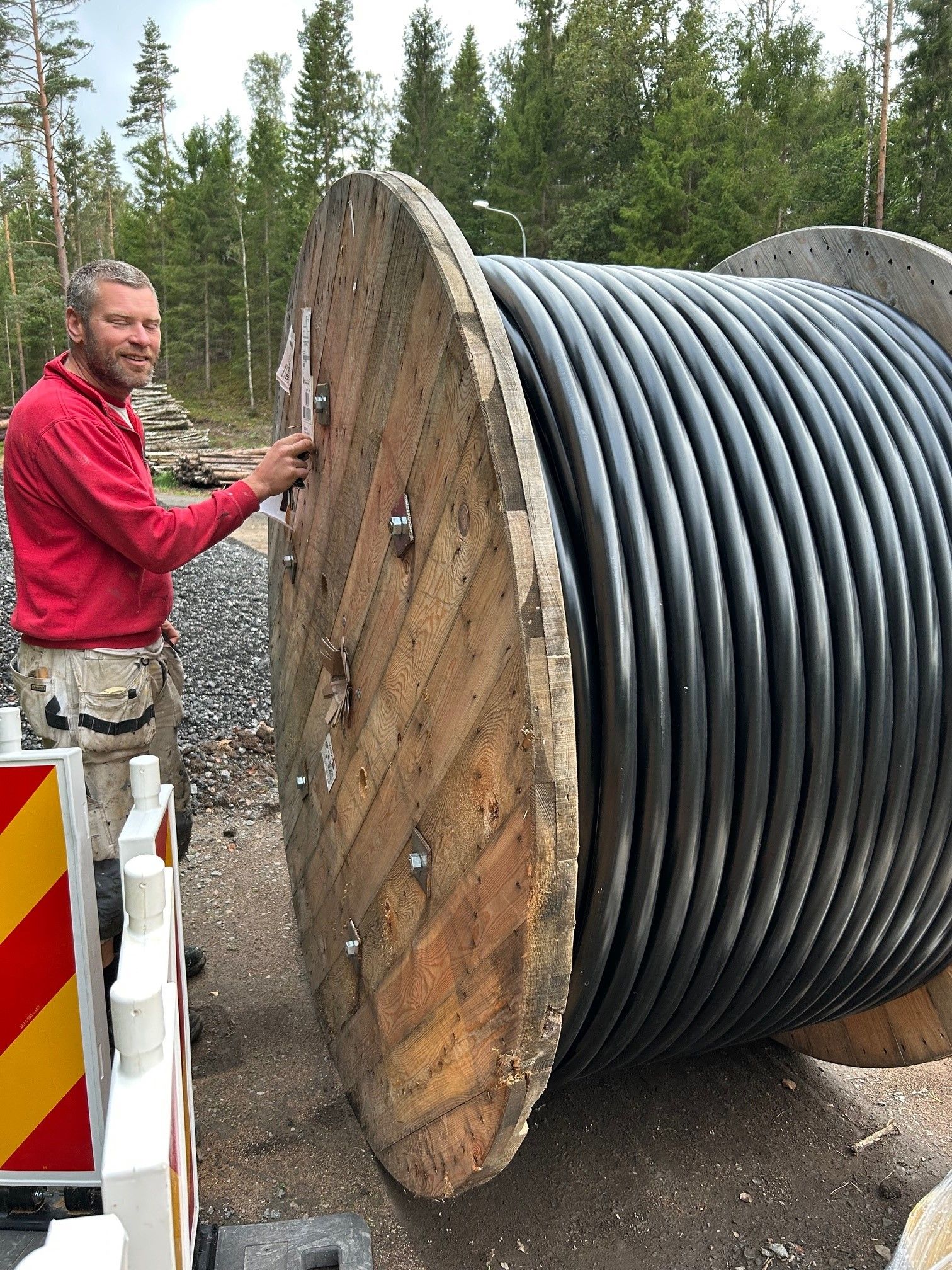 Bilden visar sista biten fram till Vattenfalls transformator, samt Anders jämte en käck liten kabeltrumma (240mm2 410m).