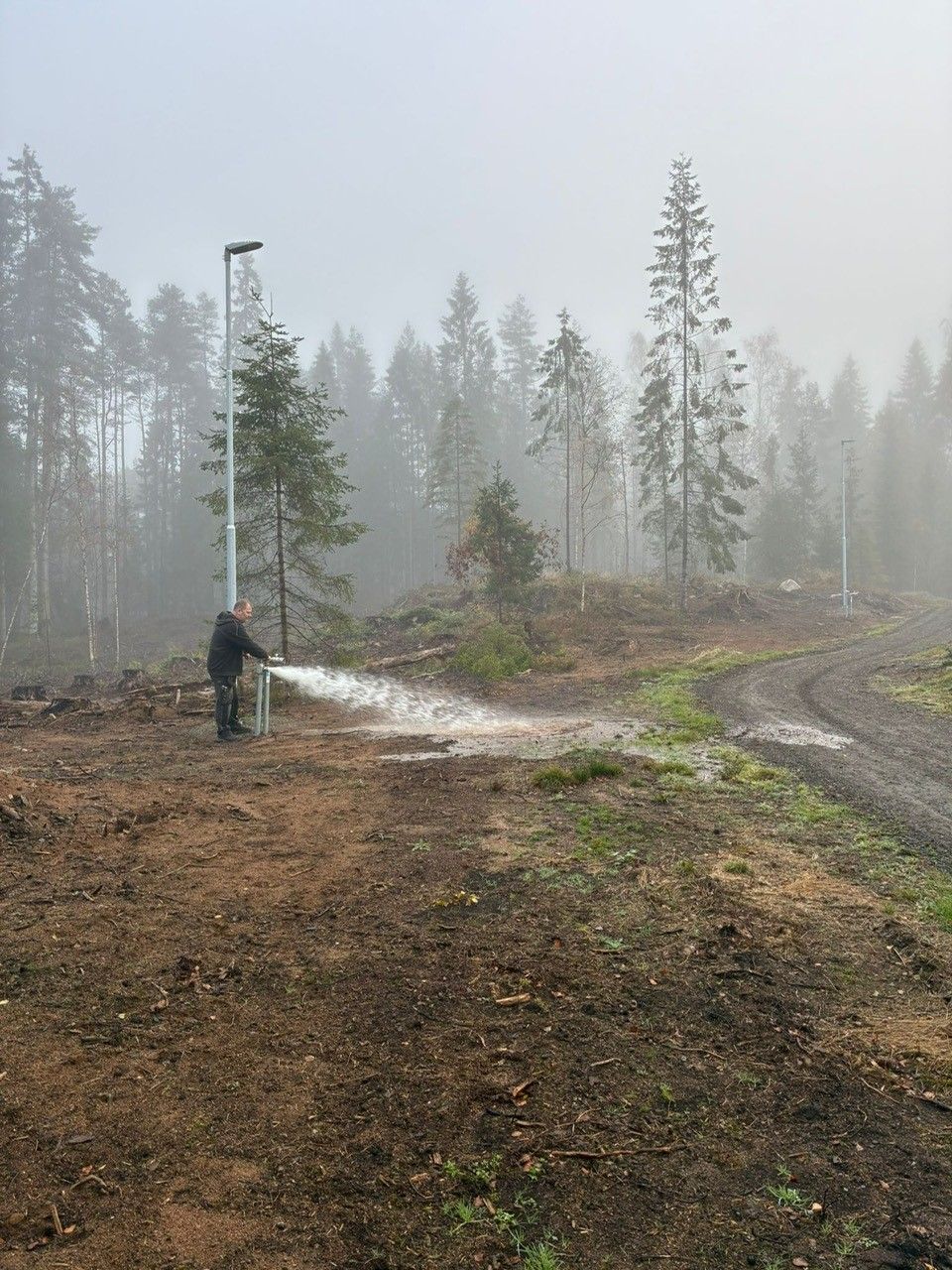 Samtliga trästolpar från stugan till ängen, samt på och runt ängen kommer ersättas med nergrävd kabel och nya stolpar med energisnåla LED-armaturer. Finlirat med fundamenten idag, blir bra.