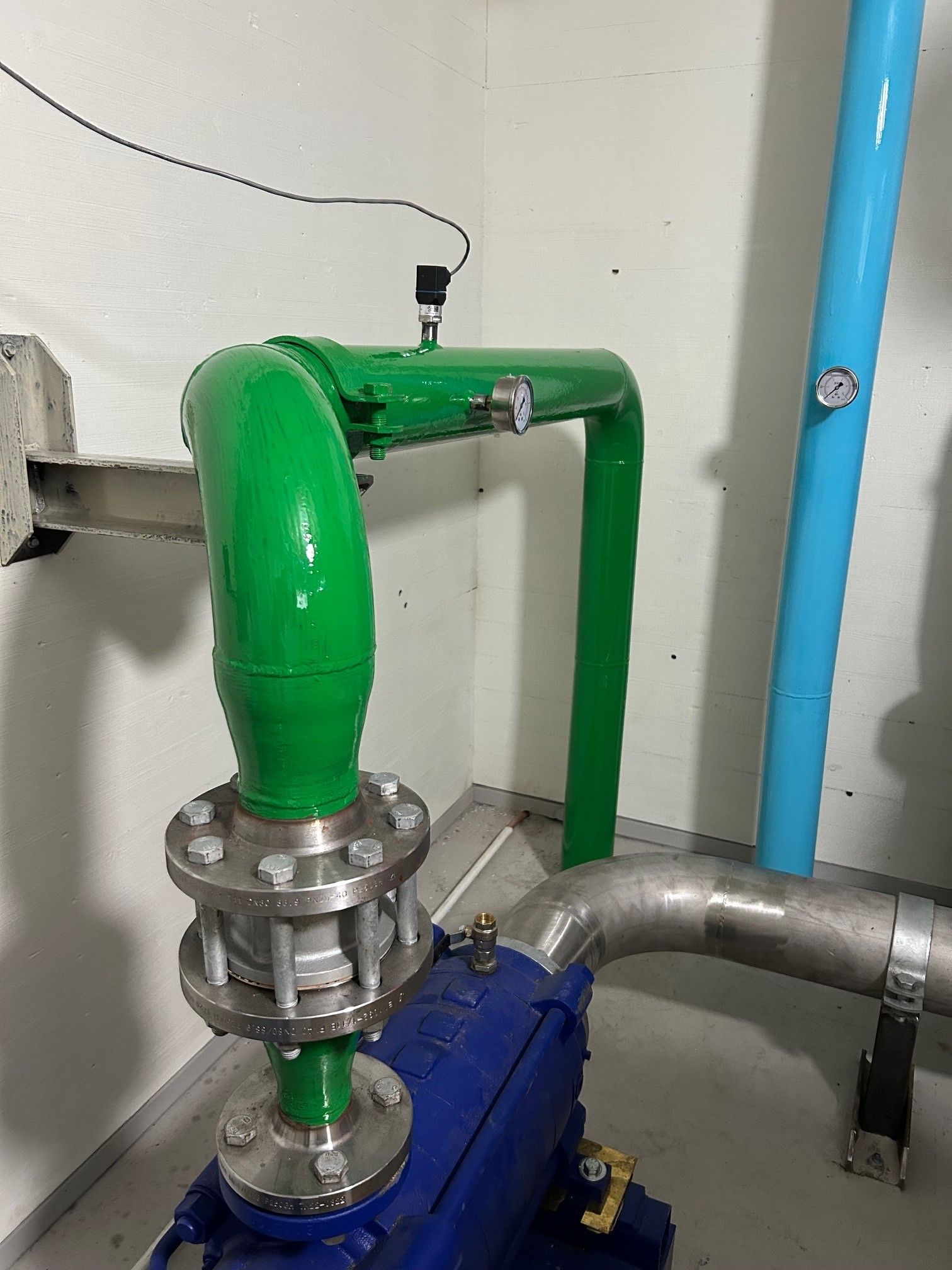 På tre ställen i systemet finns s.k. lågpunkter där vattnet kan tappas ur rörsystemet efter avslutad produktion. Bilden visar en sådan lågpunkt.